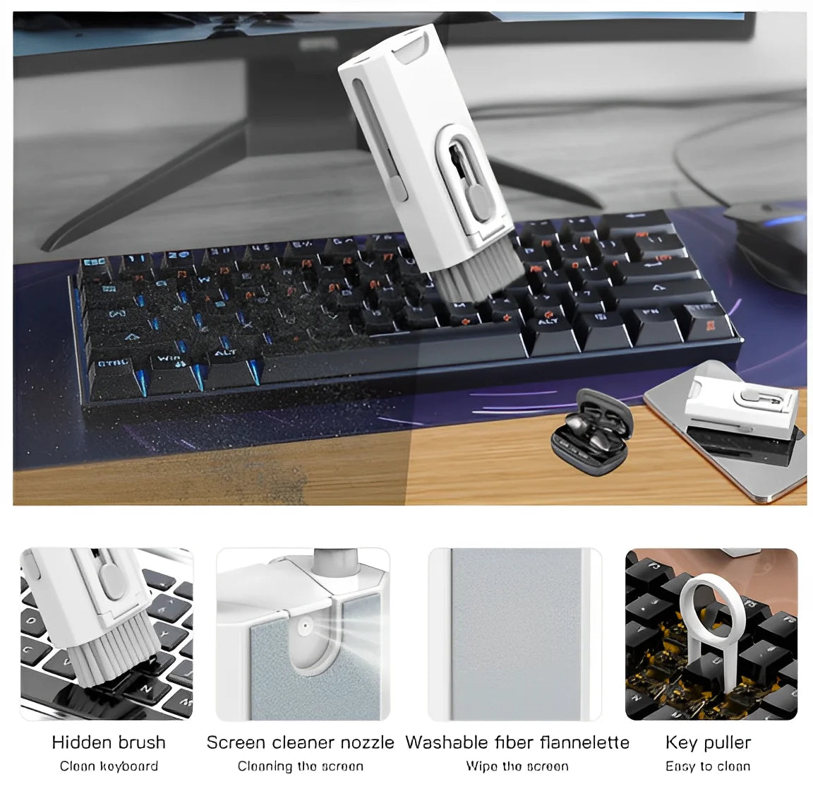 O Kit Limpeza de Eletrônicos foi projetado para alcançar até os menores espaços, removendo sujeira, poeira e germes acumulados em seus dispositivos. Com cerdas macias e tecnologia antiestática, ele protege as superfícies delicadas e melhora o desempenho de seus equipamentos.